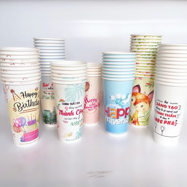 Ly giấy 22oz tráng PE, an toàn, đựng sinh tố nước ép, 1 lần, trắng/họa tiết, lốc 50 cái, sản xuất Việt Nam.